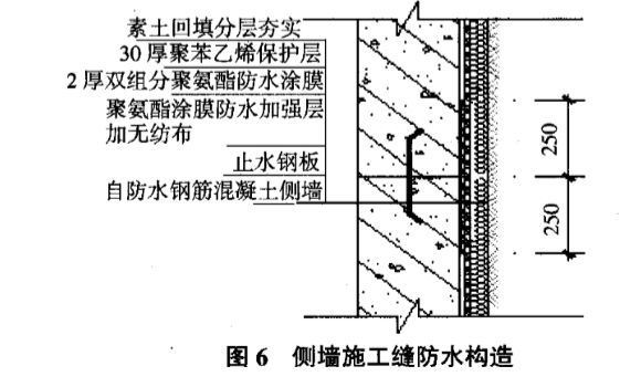 側(cè)墻水平施工縫兩邊250 mm范圍內(nèi)增設(shè)防水層一道。具體處理,見(jiàn)圖6。
