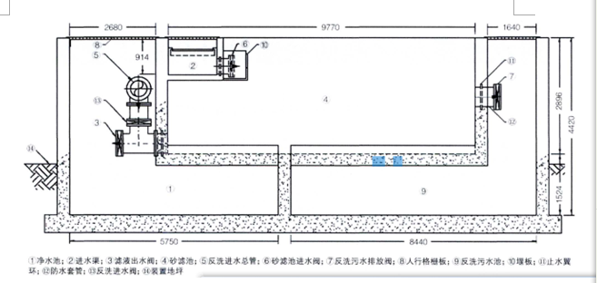 水質(zhì)凈化池池體結(jié)構(gòu)包括進(jìn)水渠、4座凈化砂濾池、濾后凈水池、反洗污水池,池體凈尺寸20840mn1×14690mmx4420mm(長(zhǎng)×寬*高),容積135 3m'3,池壁厚度300mm-500mn,。4座砂濾池交替進(jìn)行過(guò)濾、反洗和化學(xué)清洗。回川水凈化處理后.m水進(jìn)入凈水池,反洗水進(jìn)入反洗污水池。水質(zhì)凈化池池體結(jié)構(gòu)的設(shè)計(jì)斷面如圖l所示。