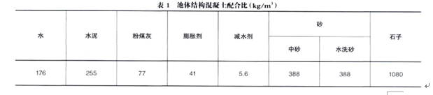 后坍落度13.2cm、14d水中限制制膨脹率0.026%、28d抗壓強(qiáng)度35.4MPa、、水質(zhì)凈化池池體結(jié)構(gòu)混凝土配合比見(jiàn)表1.