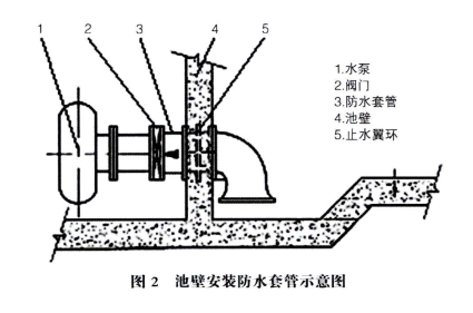 為確保管道與池壁接觸處防水效果以及避免水泵等設(shè)備運(yùn)行時(shí)產(chǎn)生振動(dòng)使接觸處松動(dòng),安裝帶有止水翼環(huán)(如圖1中⑩所示)的防水套管(如圖1中⑥所示)。防水套管的安裝與模板、鋼筋的施工同步進(jìn)行,密切配合,做到高程、位置完全準(zhǔn)確,安裝牢固。套管穿越處池壁中的鋼筋彎曲或截?cái)鄷r(shí),鋼筋與套管焊接相連,套管四周按設(shè)計(jì)要求安裝加同筋。防水套管施工如圖2所示。