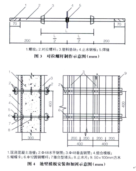 安裝池壁模板至設(shè)汁標(biāo)高,用對(duì)拉螺桿加固;按照設(shè)計(jì)要求進(jìn)行整體找平、校正后擰緊所有螺桿的螺帽;模板所有接縫緊密不漏漿、小錯(cuò)位。模板支撐系統(tǒng)采用Φ48x3.5鋼管,用對(duì)拉圓螺桿和蝴蝶卡固定,模板按400mm×400nlm分布對(duì)拉圓鋼螺桿。拆模后拆下螺桿兩頭錐臺(tái)型堵頭,將螺桿沿堵頭預(yù)留的凹坑底割除,再用防水水泥砂漿抹平模板安裝和加固如圖4所示。