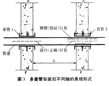 預(yù)埋套管安裝位置不準(zhǔn)確對(duì)同軸多套管的影響最為明顯:當(dāng)一根直管道連續(xù)穿過(guò)2個(gè)以上的套管時(shí),要求管道沿線預(yù)埋套管的安裝必須嚴(yán)格同軸,否則混凝土成型后,管道無(wú)法安裝,當(dāng)套管之間的距離L較小時(shí),此問(wèn)題尤為嚴(yán)重。同軸多套管安裝后不同軸的示意圖見(jiàn)圖3。