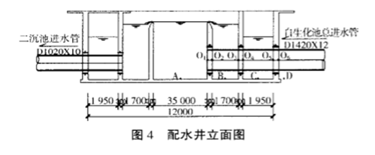 本文以污水處理廠常見(jiàn)的二沉池配水井為例,說(shuō)明同軸多套管的安裝控制。某圓環(huán)形二沉池配水井為中心層配水、中間層進(jìn)水、周邊層出水工藝,其立面圖見(jiàn)圖4,其中心配水層進(jìn)水管一自生化池總進(jìn)水管D1420x12,連續(xù)穿過(guò)3道隔墻,共需預(yù)埋3個(gè)防水套管,且套管之間的間距較小,僅為2m左右。如何控制此3個(gè)套管的預(yù)埋精度至關(guān)重要。