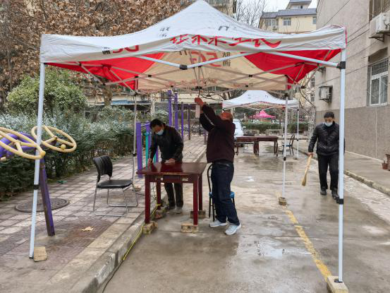 “微信運(yùn)動(dòng)幾萬(wàn)步”,確保每棟樓、每個(gè)人做核酸。受疫情影響,大家不能出門(mén),只能待在家里,然而,六隊(duì)志愿者日行萬(wàn)步卻成為常態(tài)。代王基地設(shè)置了代東社區(qū)核酸點(diǎn),西安基地設(shè)置了明園社區(qū)核酸點(diǎn)。每次核酸檢測(cè)志愿者都要與社區(qū)人員進(jìn)行對(duì)接,協(xié)調(diào)社區(qū)共計(jì)900人左右的核酸隊(duì)伍,維護(hù)現(xiàn)場(chǎng)秩序。“12號(hào)樓一單元的同志,下樓做核酸了”、“15號(hào)樓3單元的同志,下樓做核酸了”,為防止人員聚集,造成交叉感染,院內(nèi)租住的用戶(hù)都是志愿者一樓一樓的叫下來(lái)的。代王基地院子內(nèi)一共10棟樓,360人,西安基地一共4棟樓,290人。為確保不漏一戶(hù)、不漏一人,志愿者每次都要一次次的繞著院子來(lái)回的“喊”。除此之外,志愿者要在核酸檢測(cè)人員來(lái)之前擺好核酸檢測(cè)設(shè)施,拉好警戒線(xiàn),連接網(wǎng)絡(luò)專(zhuān)線(xiàn)、通電、安裝照明燈,一片都不漏的對(duì)場(chǎng)地以及進(jìn)院子的人員進(jìn)行徹底消殺。在核酸檢測(cè)結(jié)束,人員離開(kāi)場(chǎng)地后,志愿者仍然堅(jiān)守在崗位上,因?yàn)樗麄冞€要將醫(yī)用垃圾專(zhuān)員清理拉走,再次對(duì)場(chǎng)地及人員做一次徹底消殺。在維護(hù)核酸檢測(cè)隊(duì)伍秩序時(shí),面對(duì)不理解、抱怨聲,他們選擇用真情感染者每家每戶(hù)。